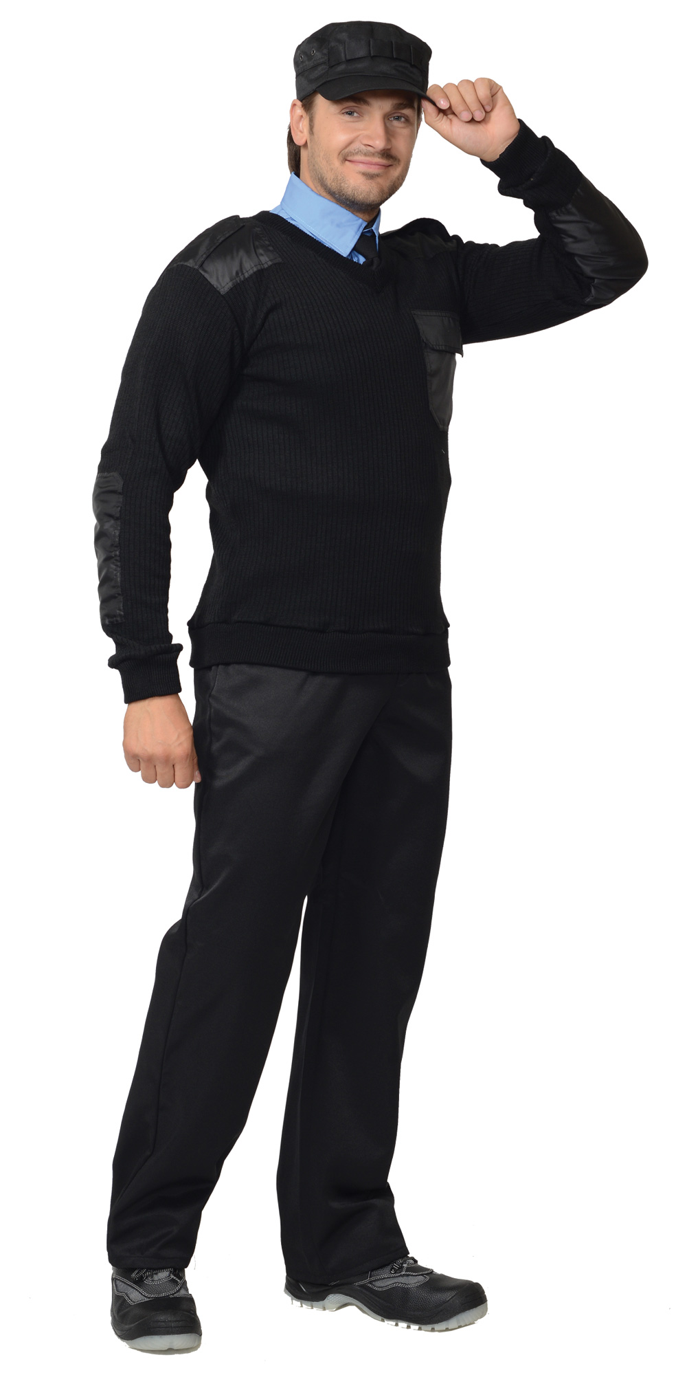 Джемпер форменный для сотрудников охранных предприятий с V-образным вырезом и с усилительными накладками в области плеч и локтей, а так же накладной карман и погоны из курточной ткани.