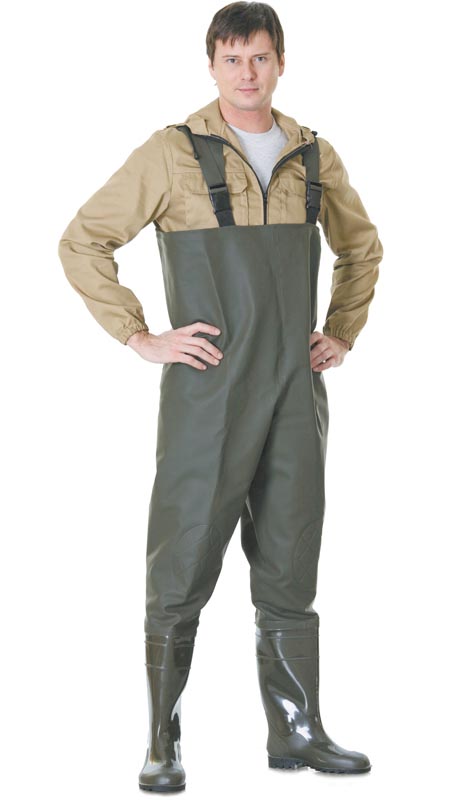 Трикотажное полотно с ПВХ покрытием. Цвет: оливковый. Приваренные сапоги. Вес - 3.4 кг. Размеры: 41-47. ТУ 2590-001-31713188-2004.