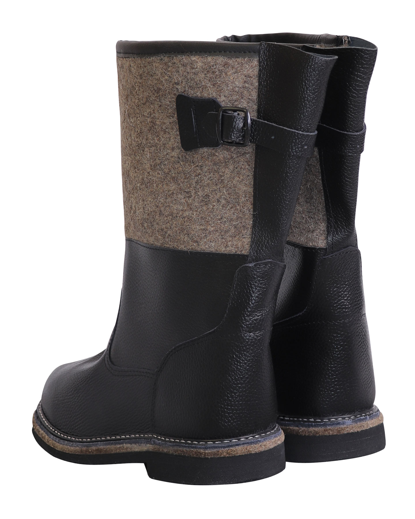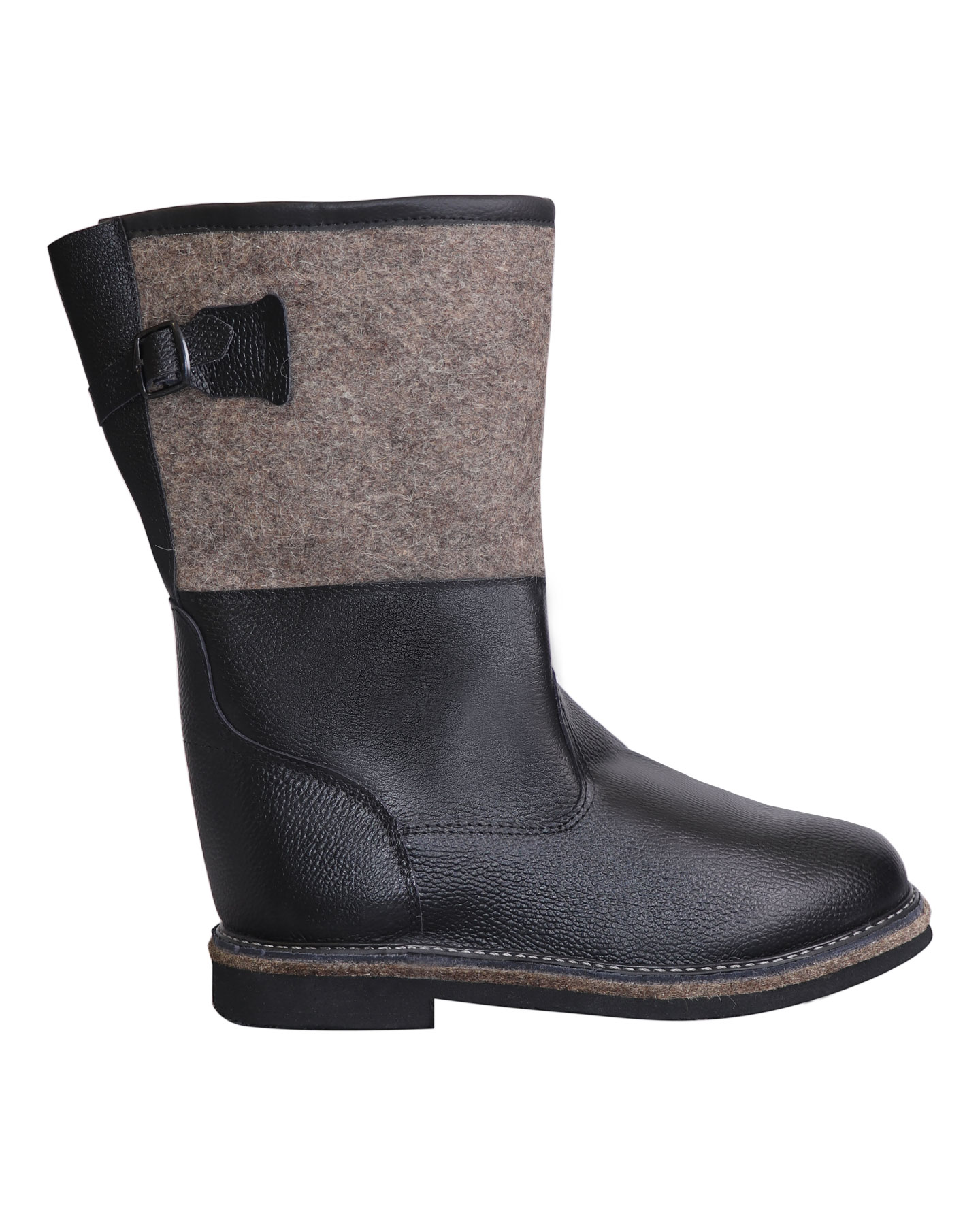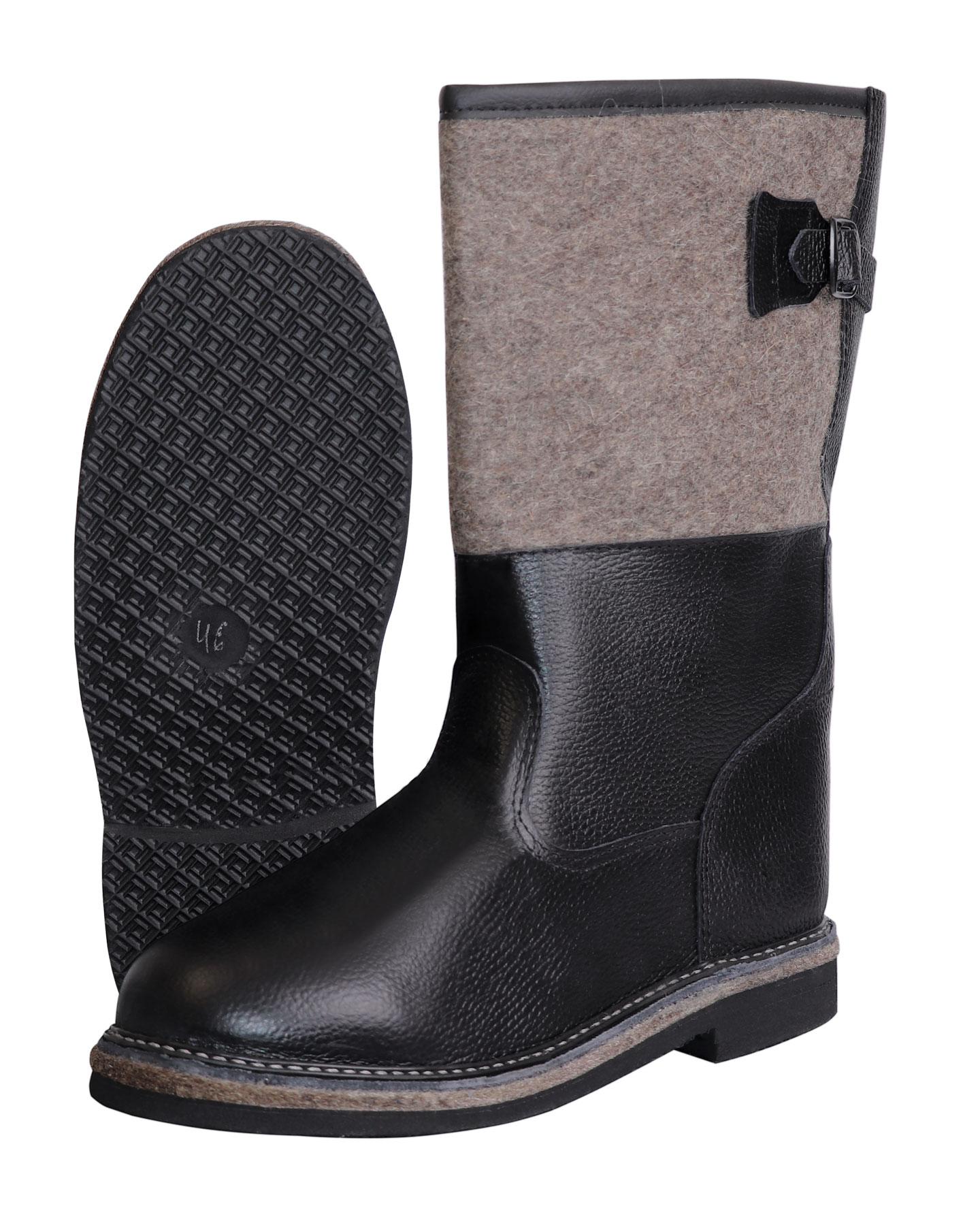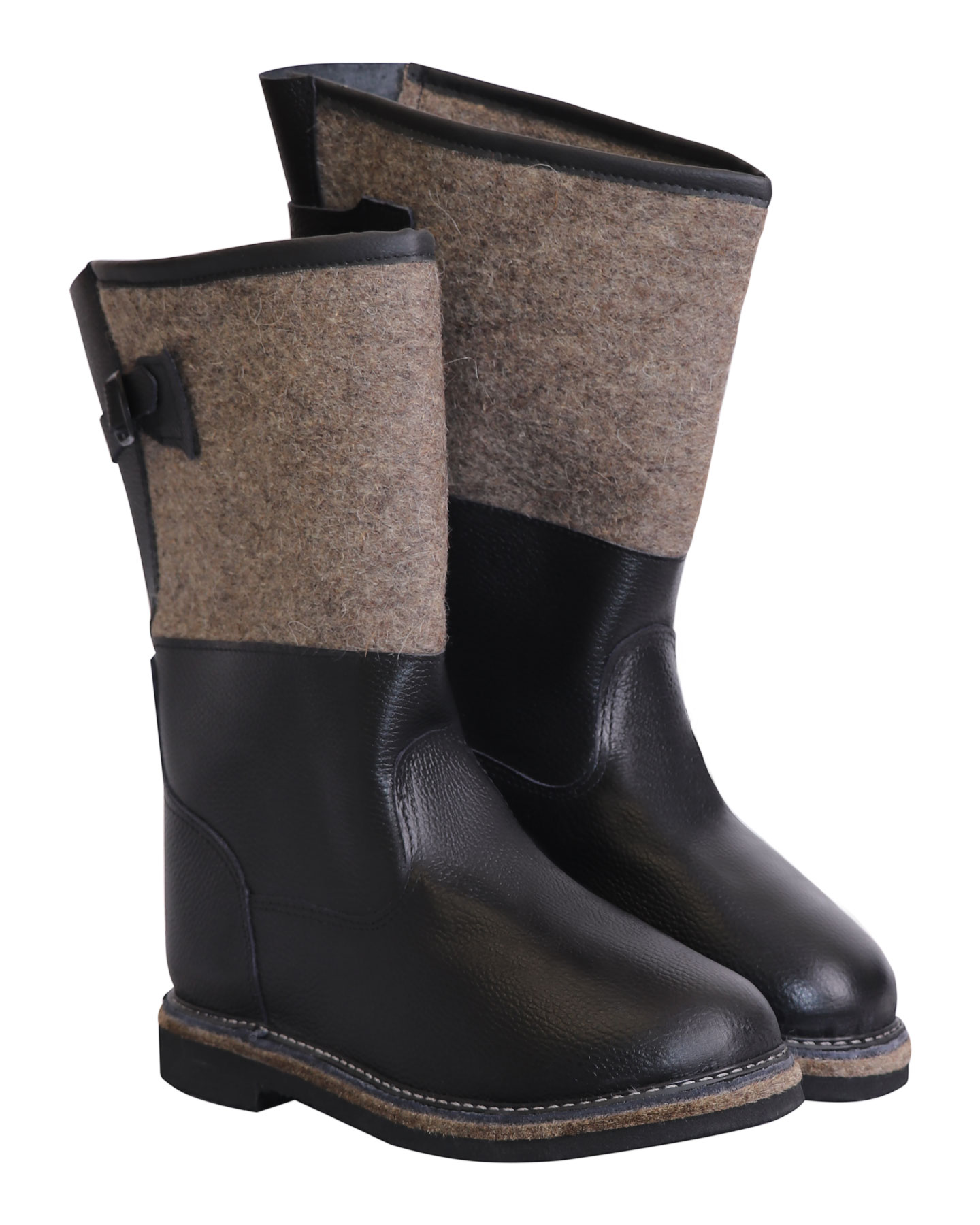 Эта модель – альтернатива валяной обуви, потому что сочетает теплоизолирующие свойства валенок (вся внутренняя часть сапог из войлока) и в то же время отлично защищает ноги от воздействия влаги (союзка и внешняя нижняя часть сапог выполнены из натуральной водостойкой кожи).