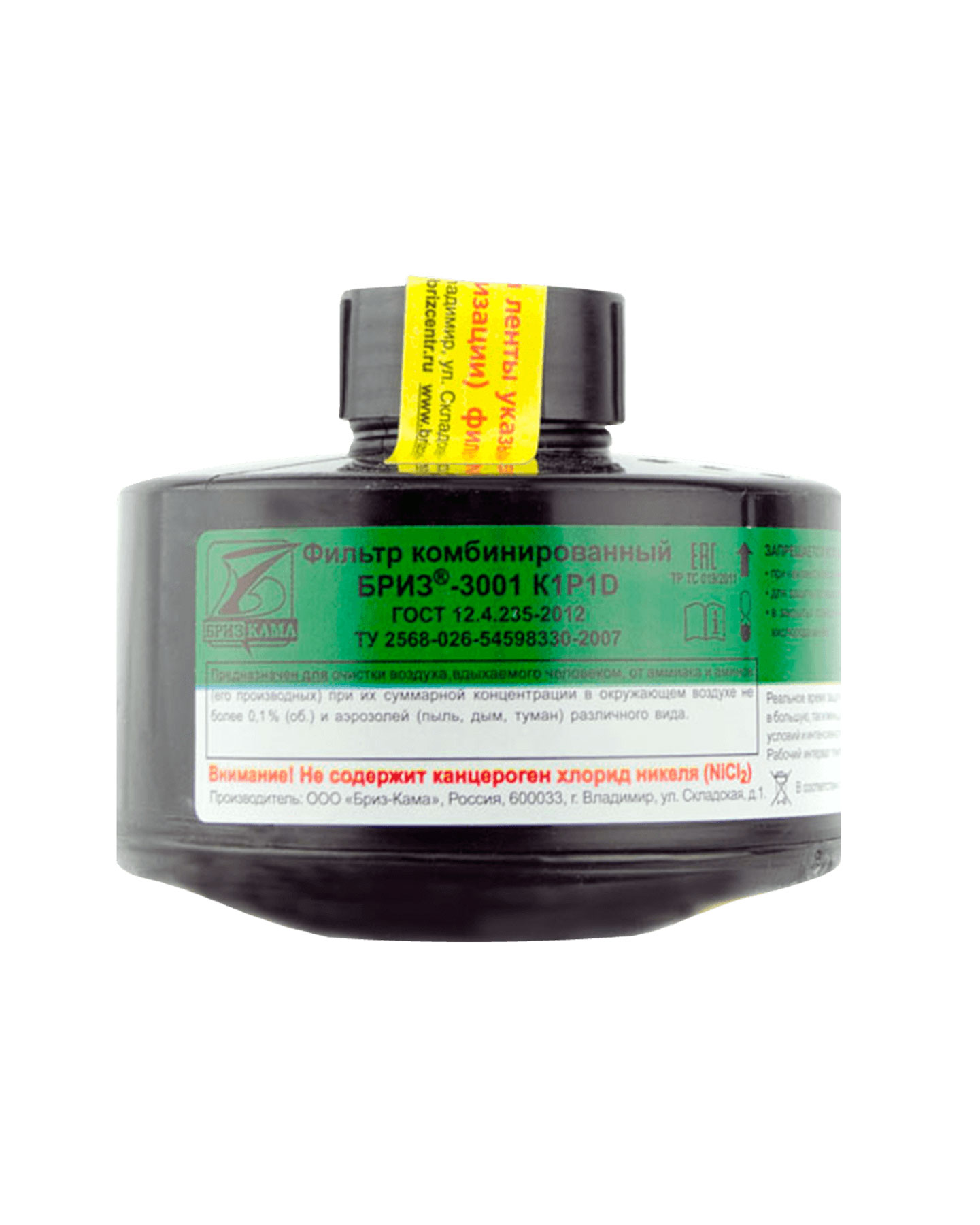 Фильтры «БРИЗ®-3001» K1P3 R D — высокоэффективные средства защиты органов дыхания с резьбовым соединением (Кр 40х4 ГОСТ 8762-75). Они обеспечивают комплексную защиту от широкого спектра опасных веществ и аэрозолей.