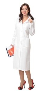 Тк. бязь, 100% х/б. Отложной воротник, застёжка на пуговицы, два кармана. Манжеты рукавов на пуговице. На спинке - хлястик. ГОСТ 12.4131-83.