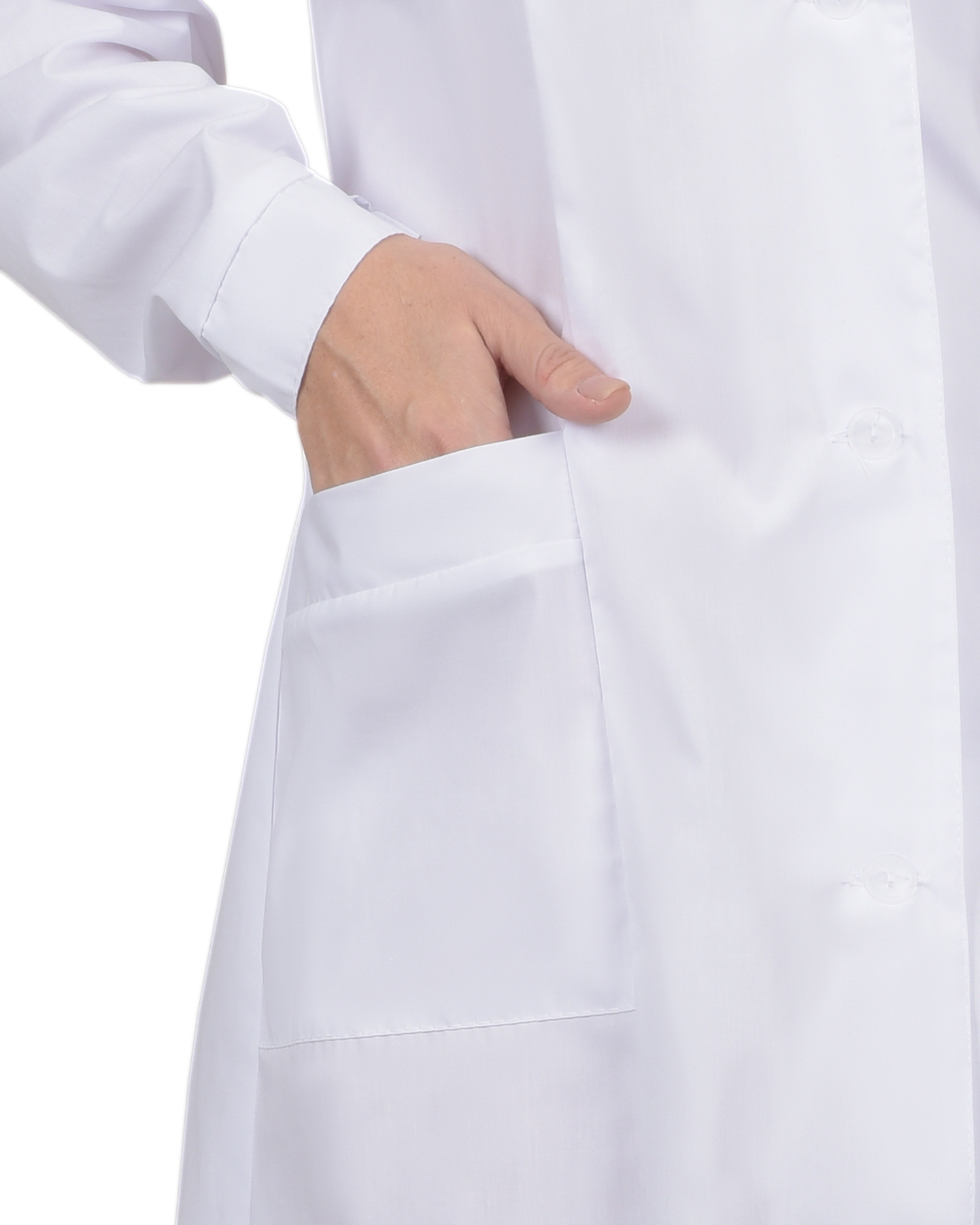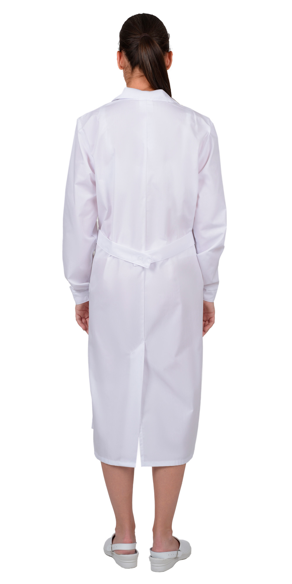 Классическая модель с нагрудным и двумя нижними накладными карманами, отложным воротником и длинными рукавами с манжетами. Ширина халата по линии талии регулируется хлястиком.