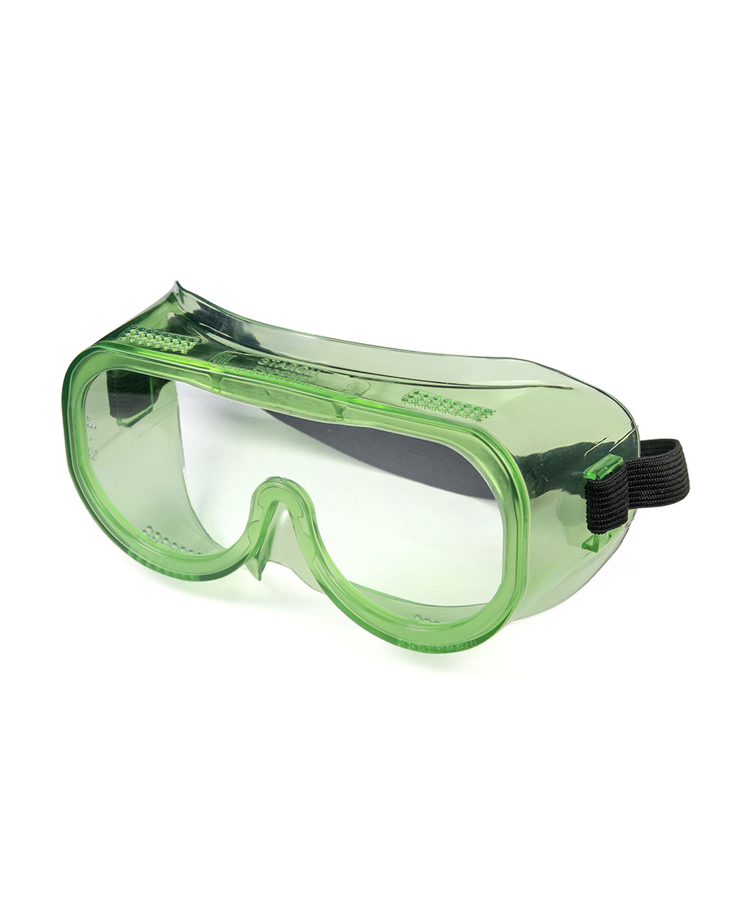 Лёгкие очки с прямой вентиляцией в мягком корпусе из ПВХ и регулируемой наголовной лентой с защитным стеклом из бесцветного поликарбоната.