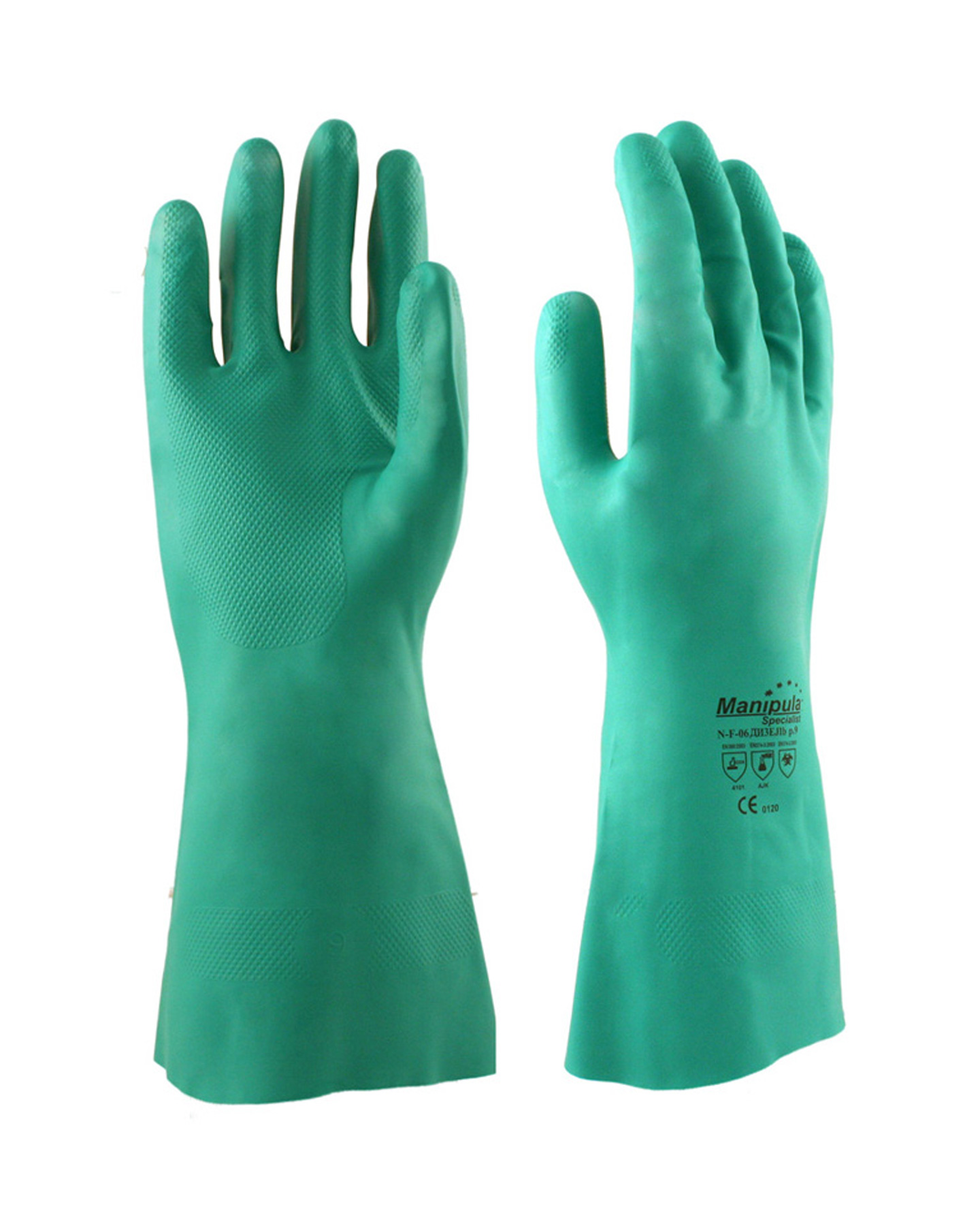 Нитрильный каучук. Внутр. покрытие: хлопковое напыление. Толщина: 0.38 мм. Манжет: гладкий. Химически стойкие - для работ с кислотами до 80%, бензином, керосином, маслом.