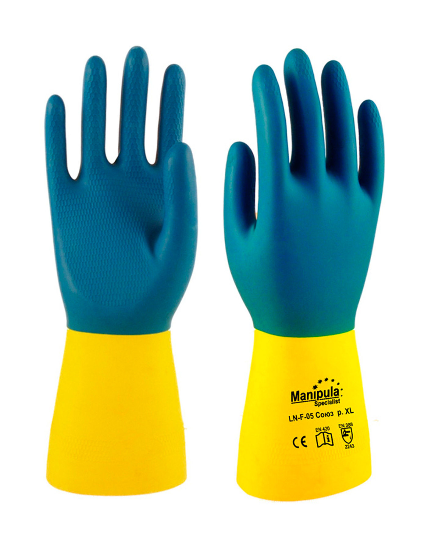 Перчатки СОЮЗ (LN-F-05) – двухслойные герметичные перчатки из латекса и неопрена, стойкие к кислотам и щелочам высоких концентраций, органическим растворителям и спиртам, растительным жирам. Неопреновая поверхность увеличивает механическую прочность, стойкость к кислотам, а также гибкость и эластичность в холодных условиях. Хлорирование поверхности для увеличения механической прочности и снижения аллергических реакций на латексные протеины. Текстура рабочей поверхности «соты» обеспечивает отличный сухой и влажный захват. Плотное хлопковое покрытие на внутренней поверхности для удобства надевания и использования, снижения аллергических реакций на латексные протеины, а также комфортной термоизоляции. Допущены к контакту с пищевыми продуктами. Для предотвращения возникновения микробной среды и устранения неприятных запахов после производственного процесса перчатка прошла антибактериальную обработку Sanitized Actifresh®. Материал основы: латекс + неопрен. Длина - 320 мм. Толщина - 0.70 мм. От кислот до 80%, щелочей до 50%, спиртов, неорган. раств- лей, жиров.