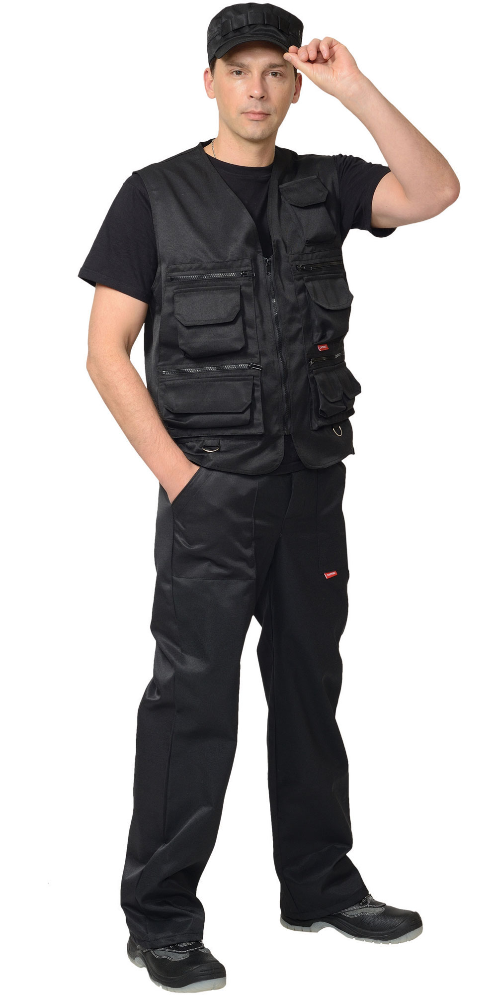 Жилет с V-образным вырезом горловины; с центральной застёжкой на тесьму - «молнию»; с различными многофункциональными карманами с объёмами и с клапанами на «липучках; хлястиками и держателями с полукольцами; фигурным низом.