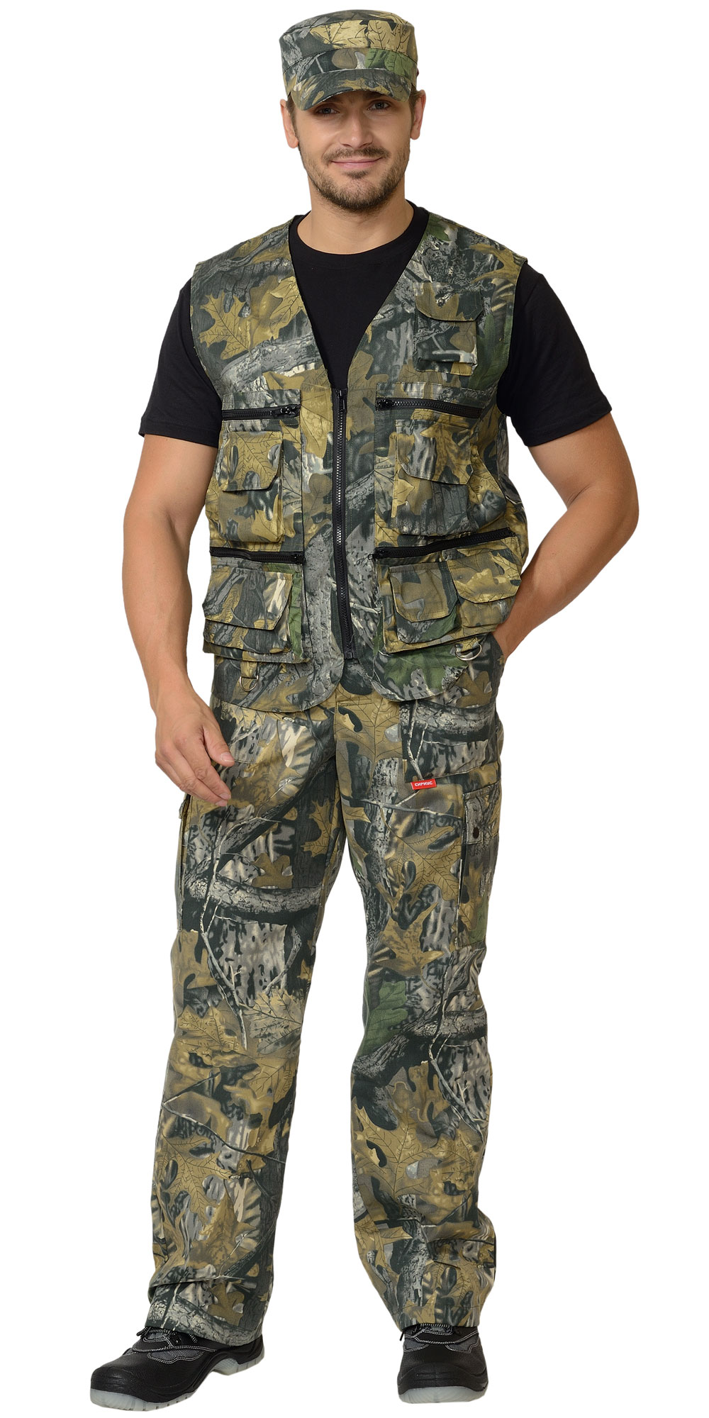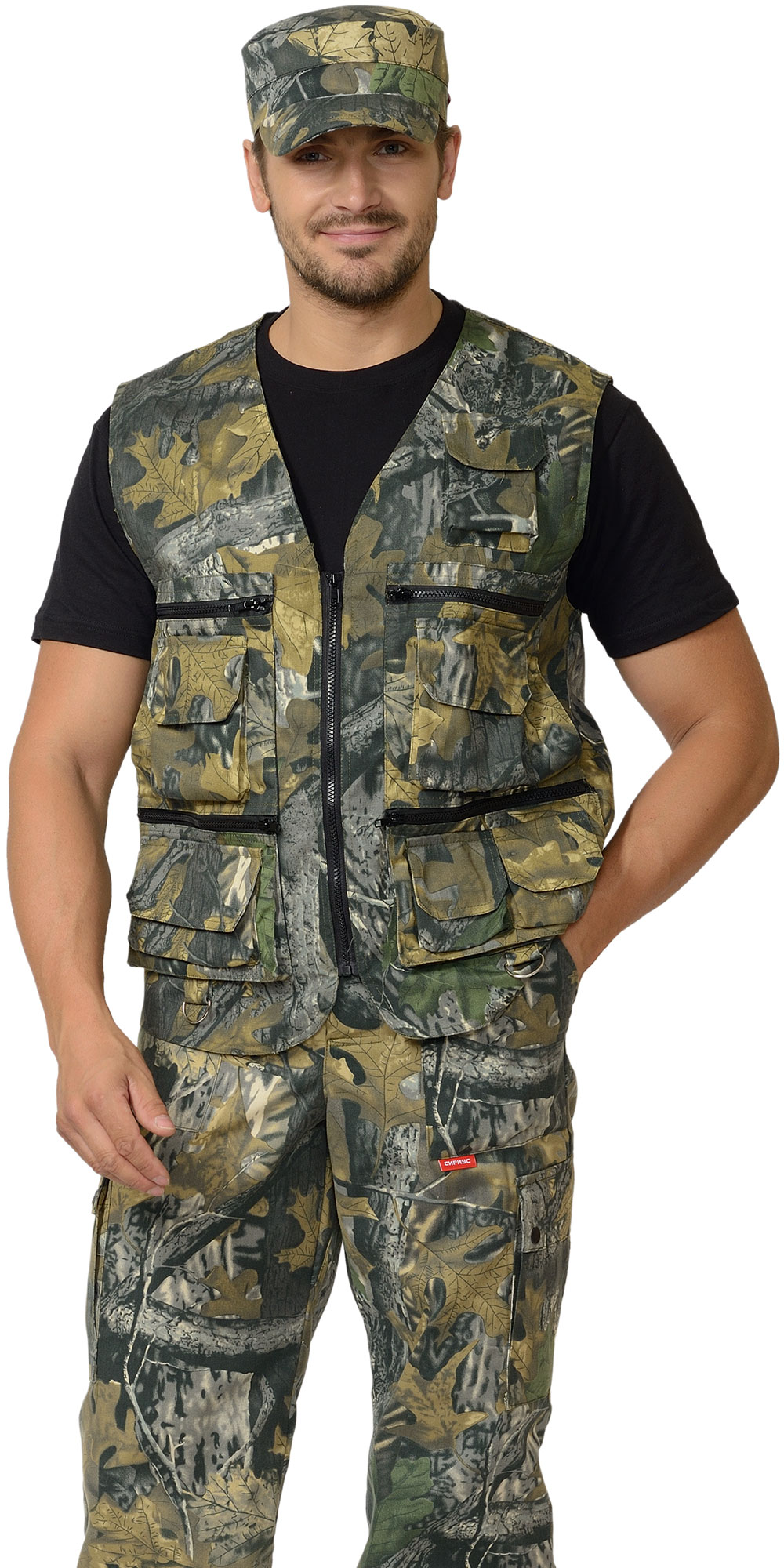 Жилет с V-образным вырезом горловины; с центральной застёжкой на тесьму - «молнию»; с различными многофункциональными карманами с объёмами и с клапанами на «липучках; хлястиками и держателями с полукольцами; фигурным низом.